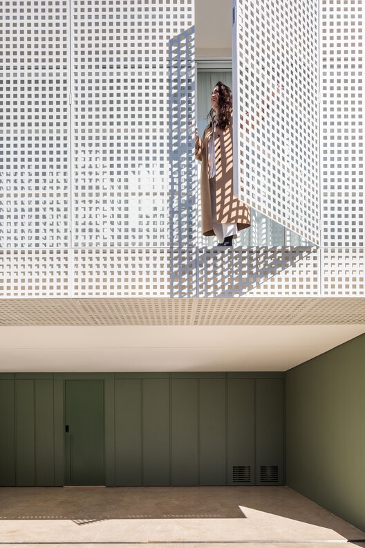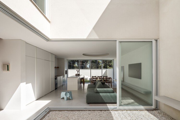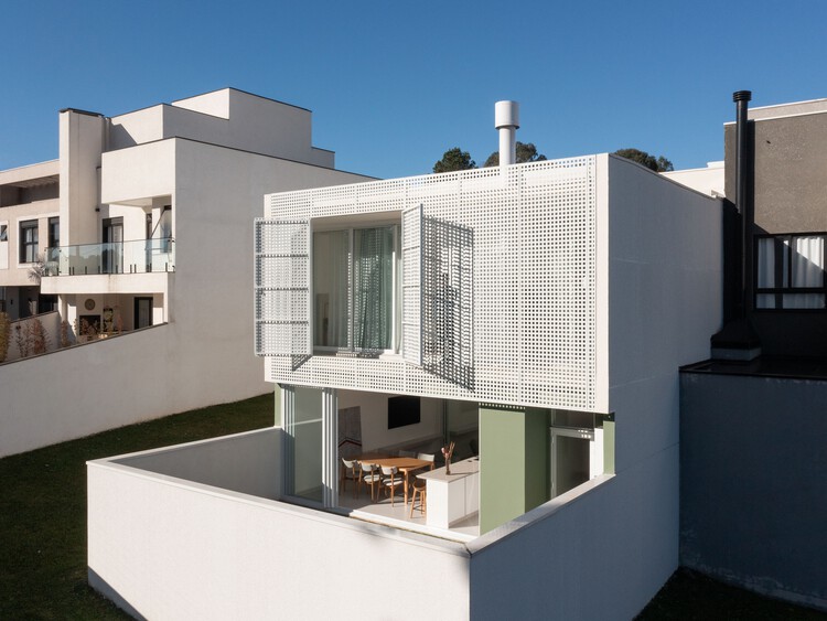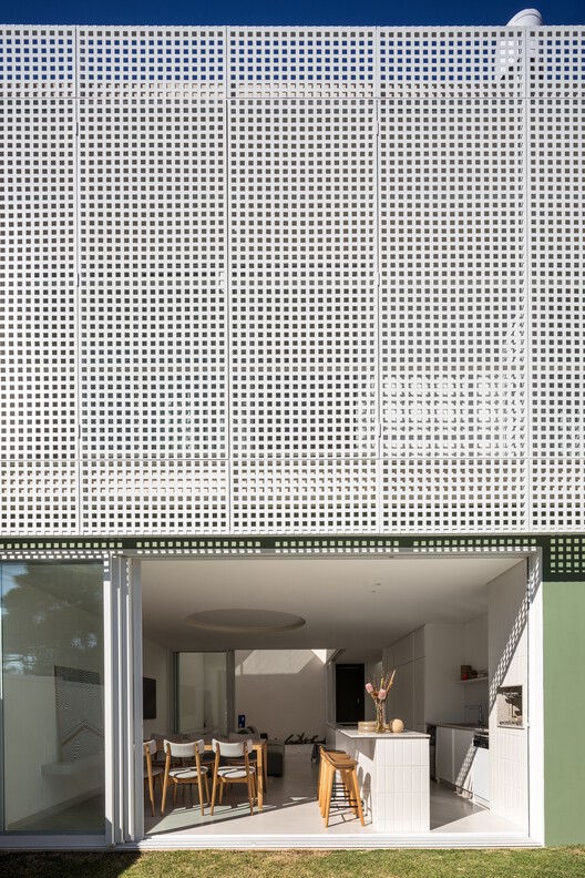 单色的外立面通过融入金属遮阳板,在物质性和非物质性之间寻求平衡,创造出透明度,而不必使用透明材料,这与这对夫妇希望融合私密和开放时刻的愿望相契合。金属遮阳板上开有小孔,为东西立面提供遮阳的同时,也为整体构图增添了有机元素,无论是通过类似皮肤毛孔的意象,还是通过遮阳板的开合运动。通过这种方式,这层遮阳板将固体与通透元素相结合,其外观在白天和夜晚之间发生了根本性的变化:在白天,形体突显出来,而在夜晚,房屋从内部被照亮,营造出一种柔和的均匀感。给这个项目带来流动性和现象性的主要方面,打破了形式的僵硬感,正是生活本身:居民的活动反映在遮阳板和阴影中,灯光的开启和关闭,以及森林中树木投下的阴影。