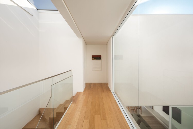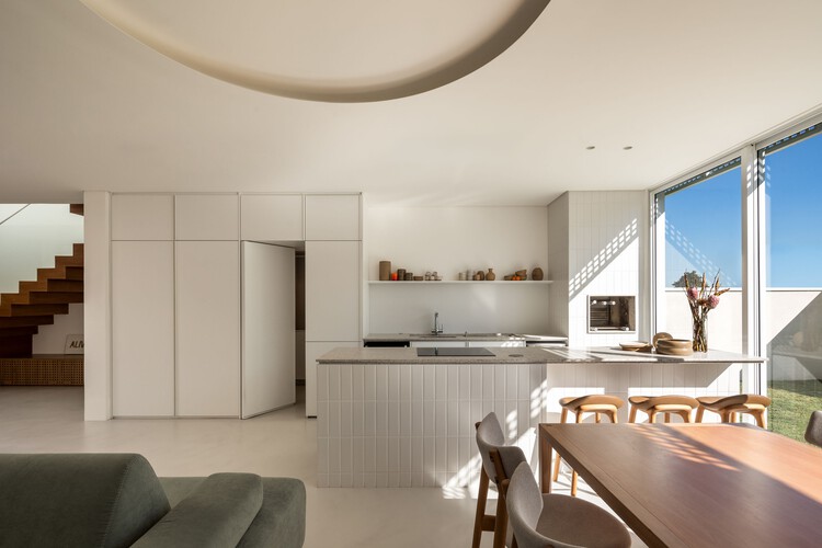 该住宅通过色彩体现了功能区的划分,一层的外立面被涂成了绿色,与上层的体量形成对比。由于无法开设侧窗,因此设计了一个内庭院,为生活区和流通空间带来了光线,同时也为房间提供了穿堂风。室内设计遵循极简主义路线,避免不必要的装饰,采用浅白色调的橱柜作为基调。因此,门把手和门都被巧妙地隐藏起来,突出了体量和平面的统一与纯净感。上层和楼梯采用木地板,为私密区域增添了温馨感。