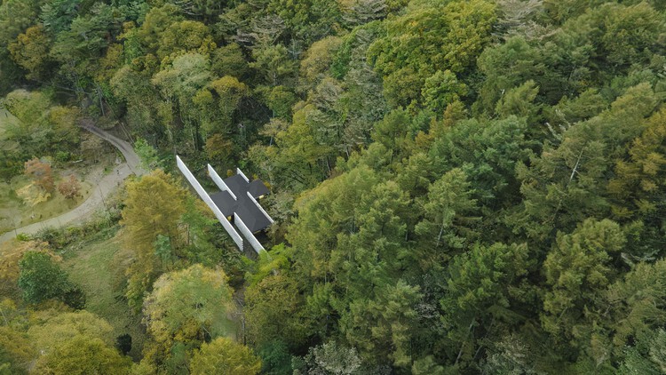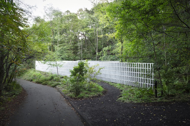 项目是位于长野县轻井泽的一座私人住宅。沿着道路坐落着一个独特的三角形建筑,长达110米。一个创造性的解决方案对于能够确保防止路过车辆和行人窥探,同时作为沐浴自然环境的背景衬托,至关重要。