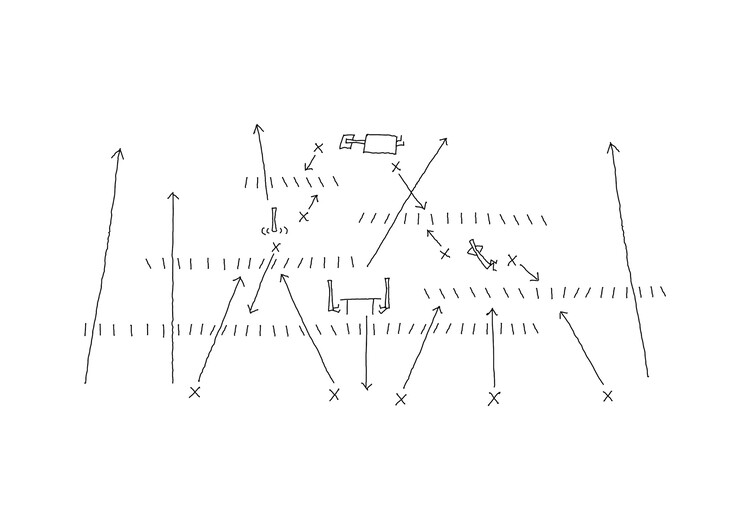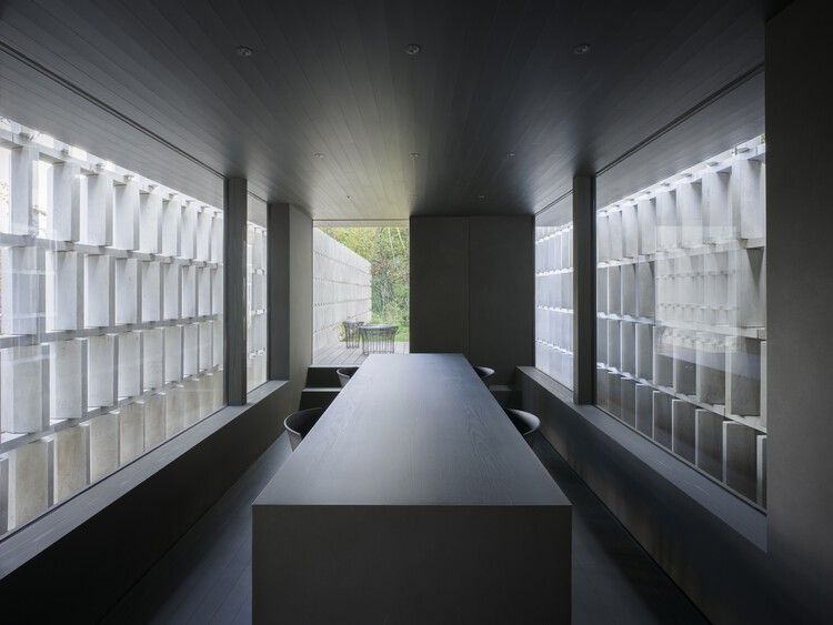 设计方法是设计混凝土砖墙作为过滤屏。通过调整每个砖块的角度来编排视线,有时通过在某些地方重叠两排砖块来进行微调。在单排的区域,视线被设定在一个方向上。当两排砖块重叠,只有当前排和后排的砖块角度对齐时,另一侧的视野才可见;否则,视线会被阻挡。