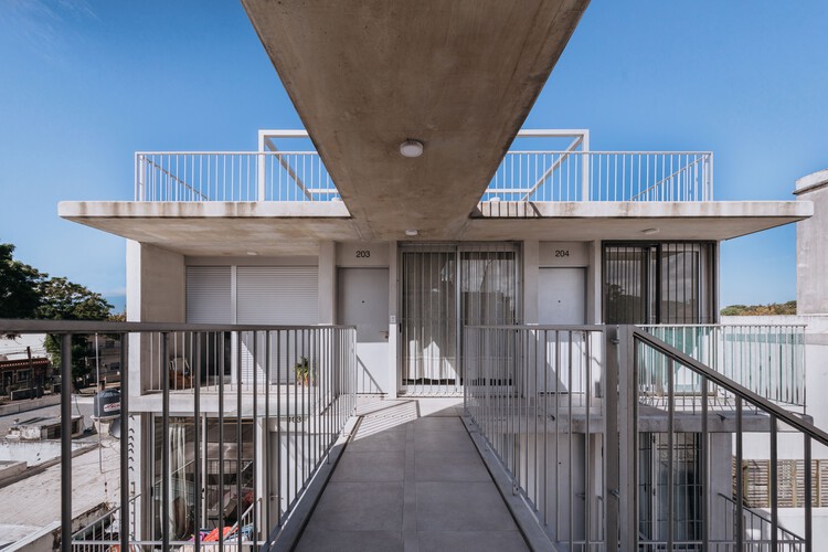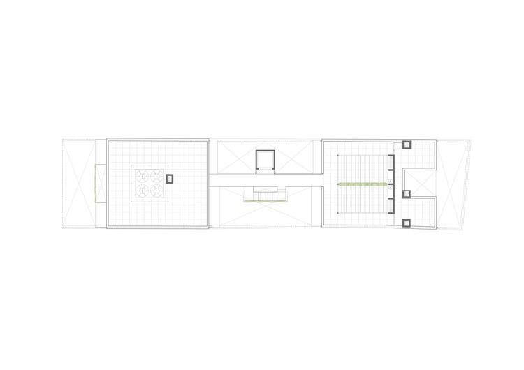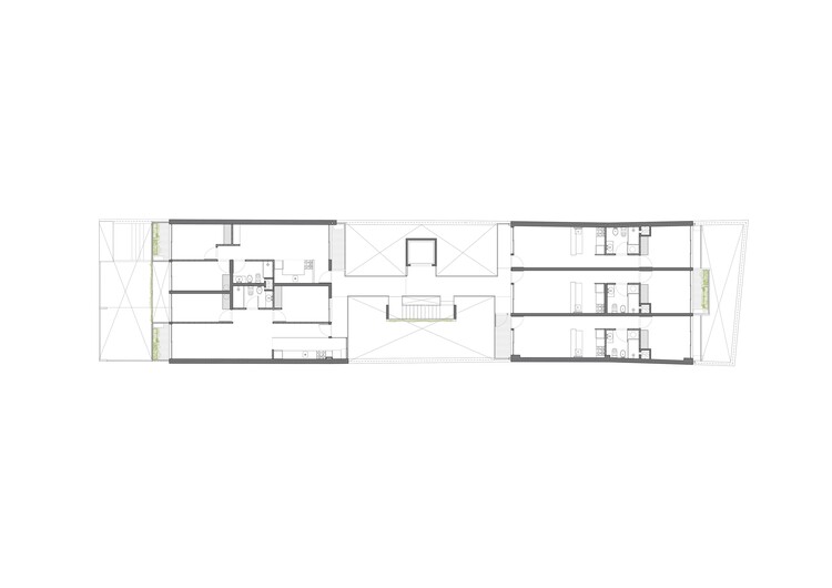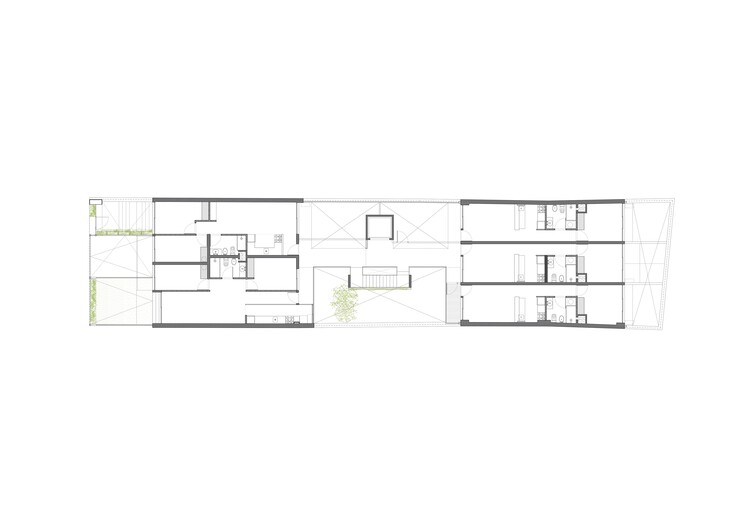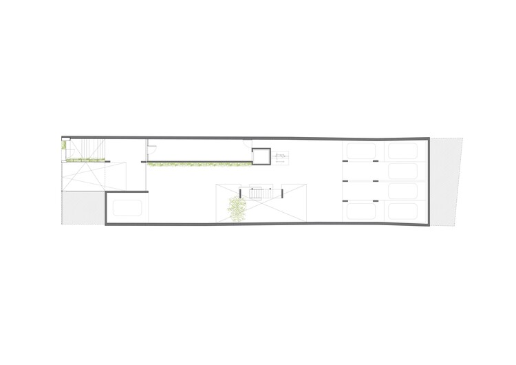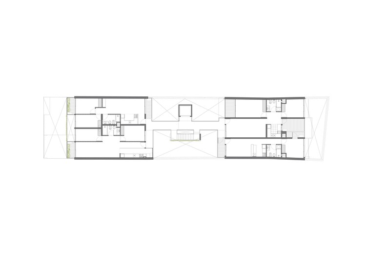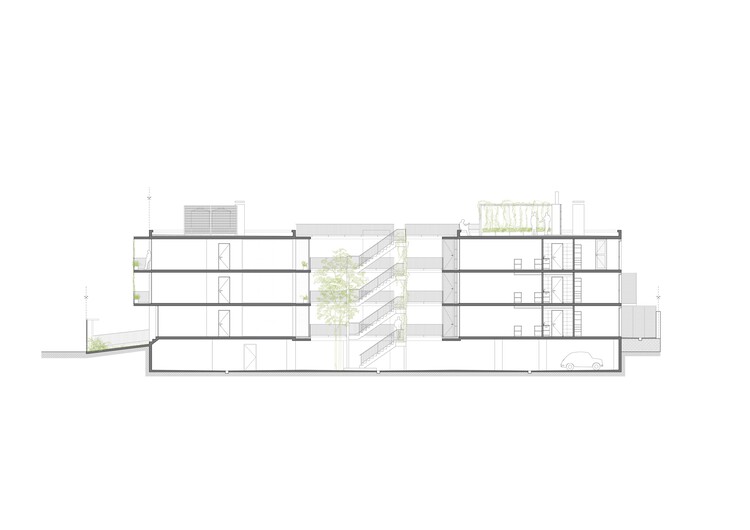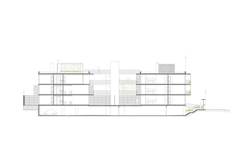 进入该综合体是通过九个车库所在的景观半地下室进入的,在那里它与垂直循环相连,该垂直循环通向三个上层,十五个双向住房单元位于该楼层。