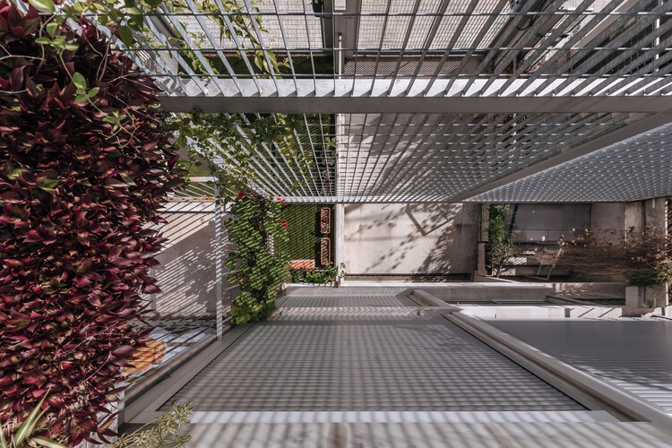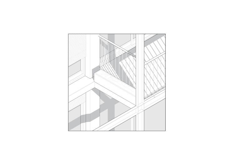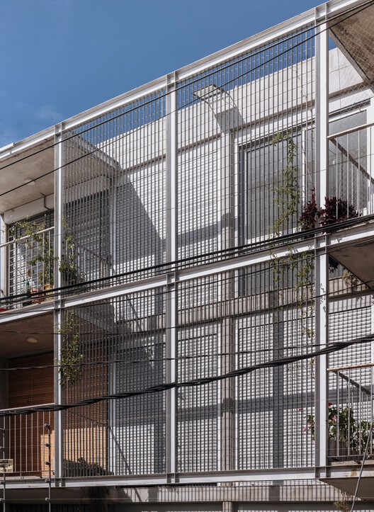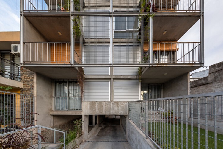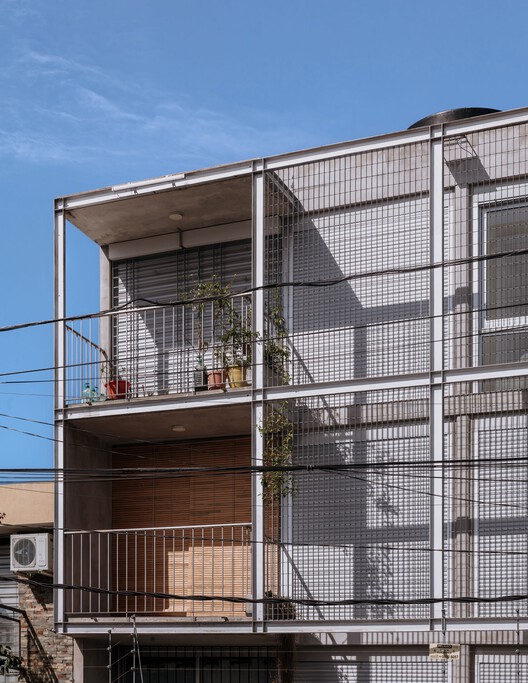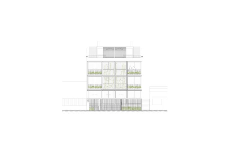 主立面由钢型材和 orsogril 面板的金属表皮组成,这些金属表皮连接到建筑物的体积上,产生一个 1.20 米宽的缓冲空间,用作植物过滤器,提供街道隐私,并容纳单元的外部空间。