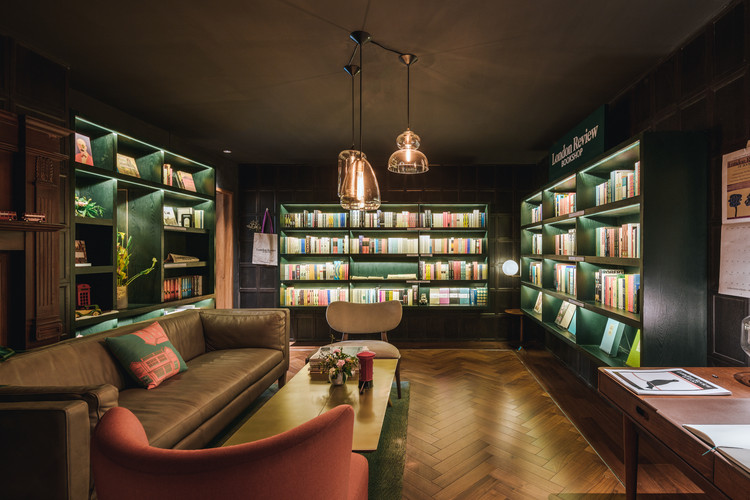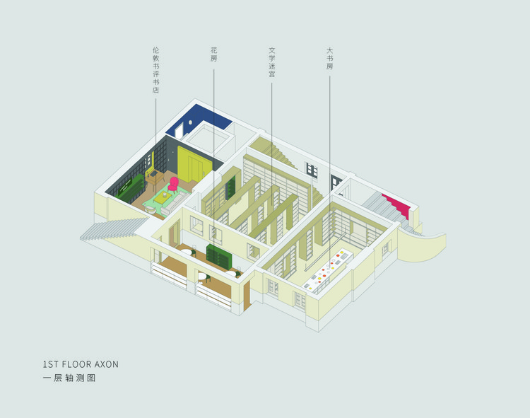 一层是思南书局的潜意识,是思南书局的历史哲学专区。一楼如同一个用书架打造的迷宫,每个人都可以在其中找到自己安身的角落。迷宫的西侧房间是思南书局姐妹店伦敦书评书店的推荐书区,东侧房间是个大书房,大书桌上陈列的是各种精致的文创产品。同时一楼还利用两个楼梯下空间构筑了一人读书处和两人读书处。南侧廊下灰空间被设计成一个花房,用盆载花为思南书局打造一个生动的立面表情。