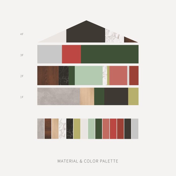 不同色相的绿色衬托出不同的展示空间。金色的一个人读书处是暗藏的惊喜,四层黑色和白色空间让人更专注于和自己聊聊,最后在四楼的屋顶平台用白色大理石创造了一个轻盈的面,所有历史的质感和知识的厚度都被消解在这个面下面。