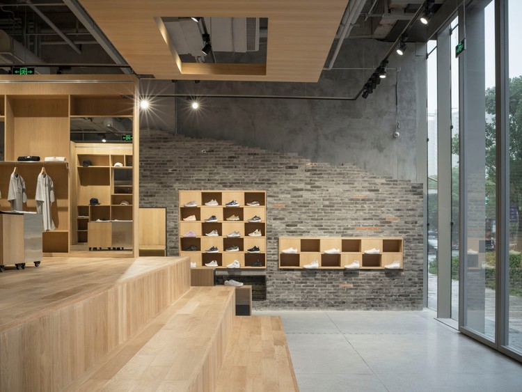右侧部分,设计了整面的青砖墙,墙面上凸起部分的木质方体,为鞋子展示的道具。凹入的部分是服装类的展示道具。不同的材质,结合凹凸变化,营造出了城市街道立面的效果。鞋墙部分的设计兼具收纳和展示的功能,满足举办活动时的需求。