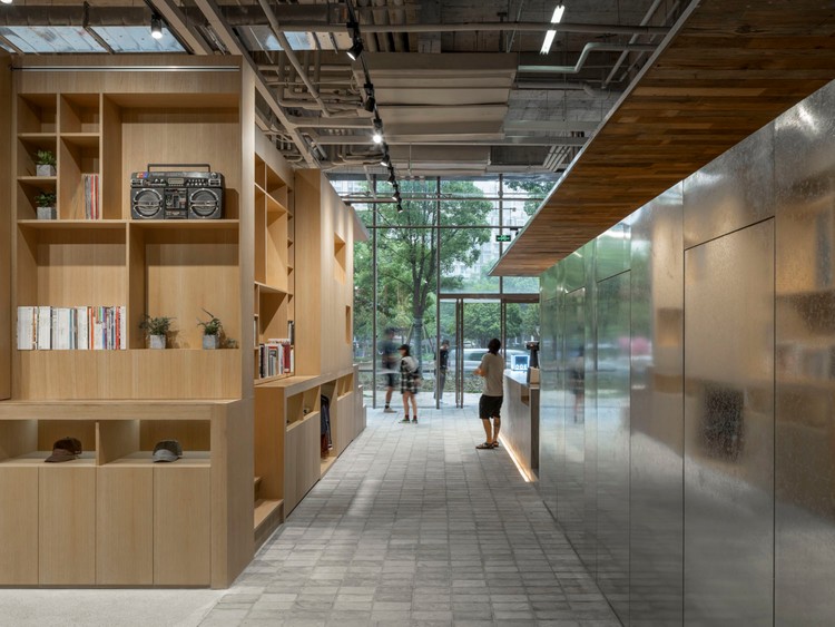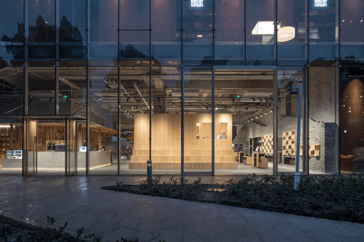 外立面的设计,保留了原建筑的玻璃外幕墙,同时在立面上增开了通高的玻璃移⻔门。当玻璃⻔门打开时,DOE店内和城市街道,形成了相对开放的对话关系。