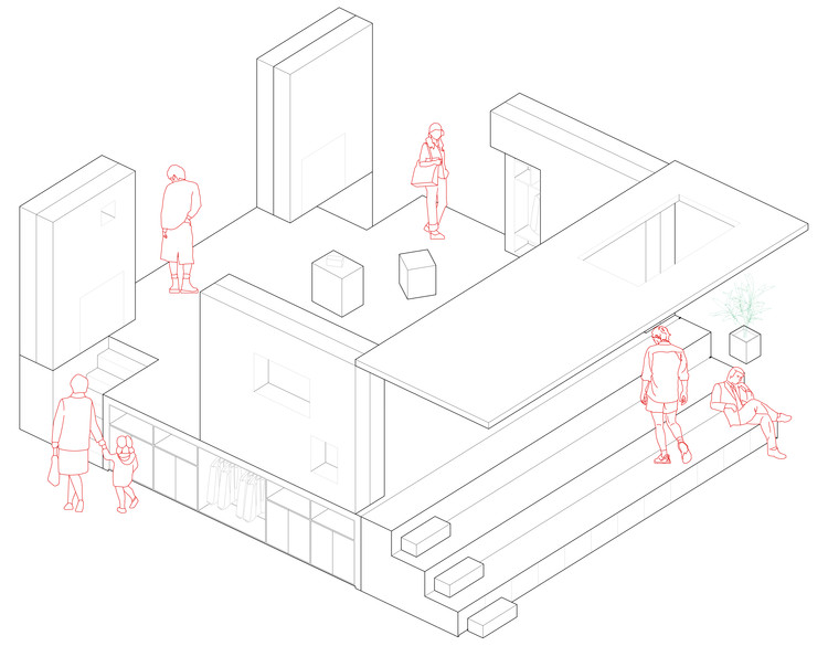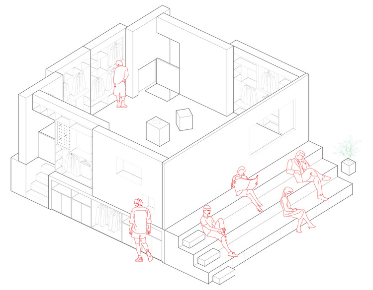 设计的最大亮点为坐落在中心的方盒子,类似于球场看台的大台阶面朝街道,拥有良好的视野和光线。看台后的四面可活动墙体,可以通过翻起,推拉等方式,将整个盒子完全打开。可活动方盒子的设计,为DOE举办活动提供了自由和便利。