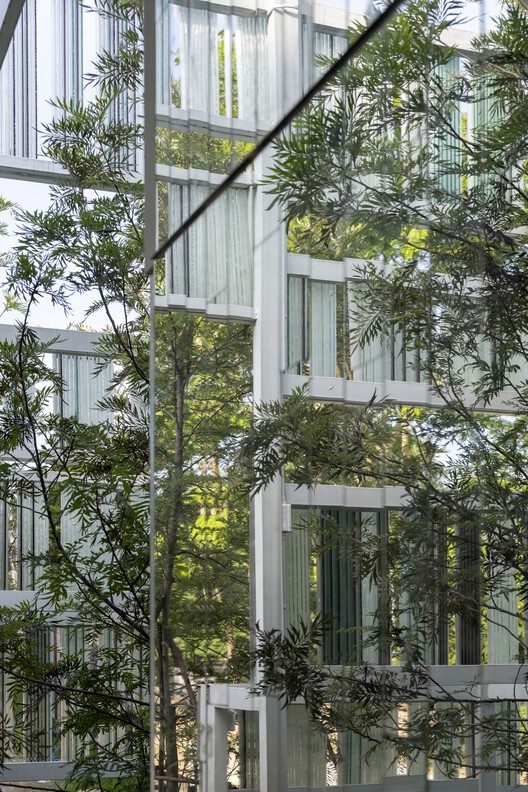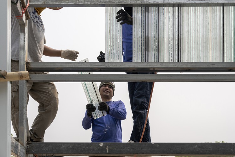 与此同时,设计团队还寻求所谓的“本土转向”——使用 10 公里半径内的建筑材料,以及当地劳动力,以避免长途通勤。其目标是利用当地人和他们熟悉的知识为这座房子制作组件。所选材料包括从一座被拆除的旧房子中挑选的元素,这些元素被重新用作新房子的门窗。原来的防盗网图案被用作前面胶合板墙的结构加固,并用旧木楼梯扶手的组件(在泰国称为“lòok klûng ban-dai”)进行软化,这些组件与胶合板墙完美融合。