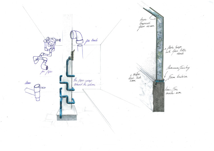 接下来,设计团队用瓶盖塑料废料进行了实验。他们从清迈的一家工厂购买了塑料碎片,以测试塑料块与光的相互作用。设计图团队选择了塑料碎片和破碎的葡萄酒瓶作为组件,将它们放置在 10 毫米厚的回收钢化玻璃之间的缝隙中。这面墙主要依靠钢结构、玻璃和塑料碎片的组合作为主要元素,为利用新材料提供了另一种途径。