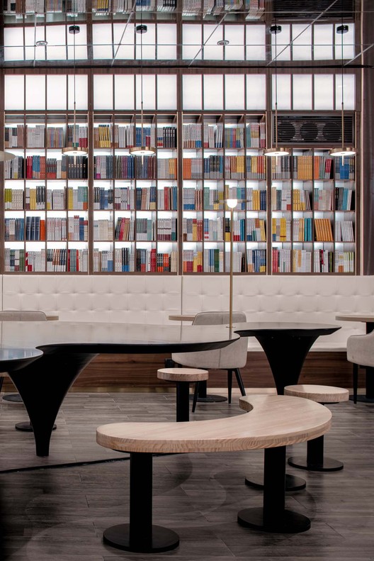 水磨石材质筑造的收银台,延伸至了咖啡阅读区。咖啡阅读区内桌椅的排列方式,散中有序,仿若“曲水流觞”。共享式的桌椅拼接手法,使得人群可以根据不同的社交需求列坐其次,共同绘出这幅雅趣十足的画面。