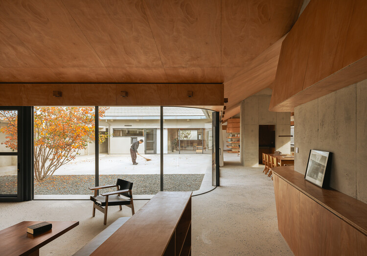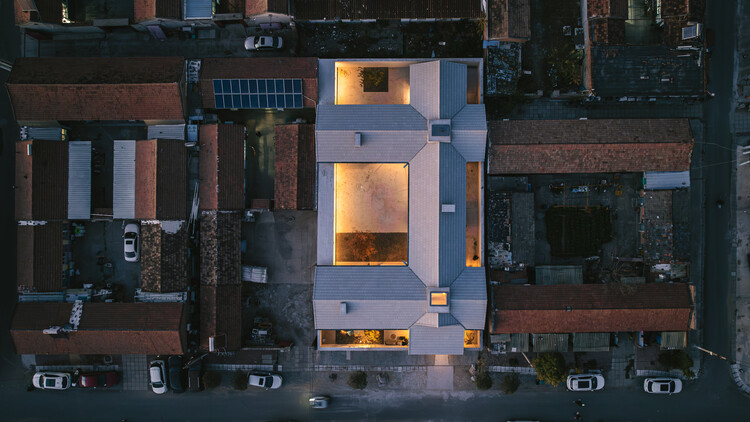 对内通透,对外则相反。建筑的唯一外立面正好也是出头的众多尽端空间之一。入口灰空间,顺着坡屋顶延续而下。且配合街道与地块的斜坡,砖砌院墙向内叠涩。整个建筑体量匍匐在路边。