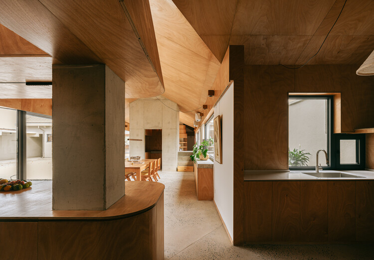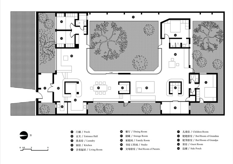 建筑的山面出头,顶向边界。从总图上看,环形建筑轮廓变成了十字交叉的图形。均质的空间,产生了若干尽端。姥姥姥爷,爸爸妈妈,小朋友,来访的客人,那些尽端容纳了大家的卧室。姥姥姥爷分开就寝,像多数老年人,更希望各自拥有独立的房间。在独属于他们的尽端,也可以产生这种细分的房间。如果把这些尽端看作伸展的触角,连接它们建筑的身体部位,被拉长和隐隐的切成段落,容纳不同的公共职能。这也观照到多代人共同生活的日常场景。人们在这些若即若离的房间中穿梭,祖孙满堂或者核心家庭的互动,都得到响应。