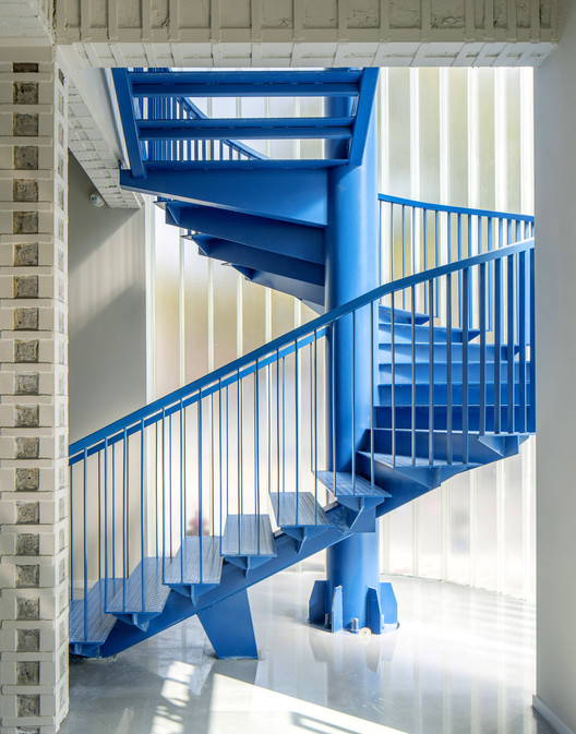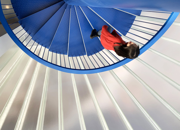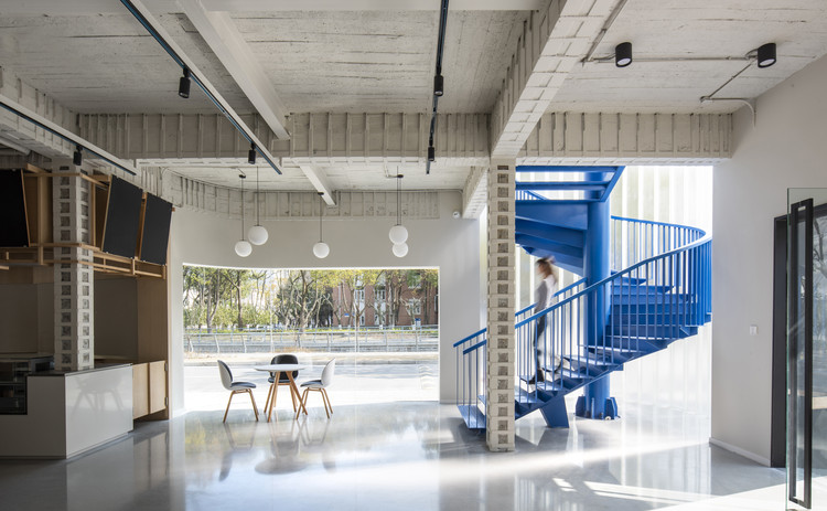 原混凝土旋转楼梯虽破旧,却在河畔与道路转角处,如雕塑般凝集了一个时期的集体记忆。为梳理流线同时重塑记忆,我们将其结构转换为室内钢楼梯,赋予“华理蓝”的色彩属性,并在外侧界面以双层U型玻璃构筑半透轻盈的介质。