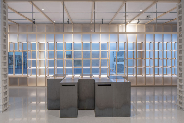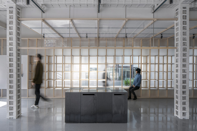 不同透度柜体中植入大小不一的透明孔洞,透明度微妙转化中,开放的界面捕捉释放了跳跃变化的光影。渐变通透的格窗悄悄吸引人窥探对面艺术实验室在发生着什么,偶发性的互动触发了探索的欲望。书店内部以几片半透明柜体作为隔墙,提升了空间整体通透性,视线在空间中蔓延,人影晃动,书籍层叠,交织如一。