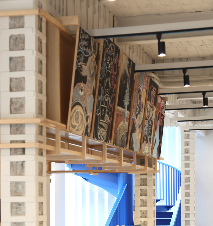 内观,U玻的物质性近乎消失,只留下由光演奏的琴弦;拾级而上,与时幻化的温柔光线包裹着身体,似是重温旧日时光,为通往二层沙龙区平添几许沐浴圣光般的仪式感。遥望,不同光线下的漫反射雕琢出蓝色旋梯的朦胧质感,楼梯上人影摇曳,暧昧而动人,演变为人与光互动的艺术装置,重新营造了“看与被看”的视觉焦点。校园的场所记忆再生,功能性的楼梯升华为形而上的精神空间。