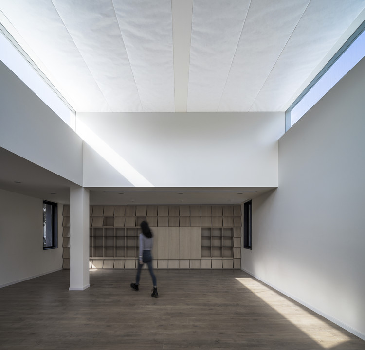 在白天的不同时间中,锋利的光影如时针漫步,从不同角度斜切打破空间,与人影引发空间对话。发光天花以杜邦纸代替普通灯膜以保证空间的整体性,杜邦纸绷紧时产生的褶皱呈现出意外的手工感,夜间形成带肌理的整体发光顶面。无论白昼与夜晚,这个倾泻光的顶层装置均为高质量的集体活动营造了特别的空间氛围。