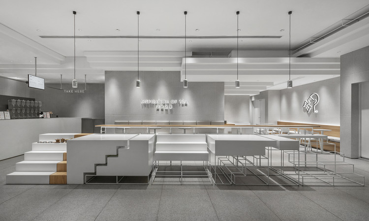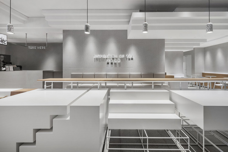 设计师将空间的功能区域如自助台等隐藏于纵横台阶之间,并为品牌方特别设计定制了一款茶具用于向顾客展示其采自不同产地的茶叶。