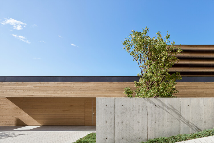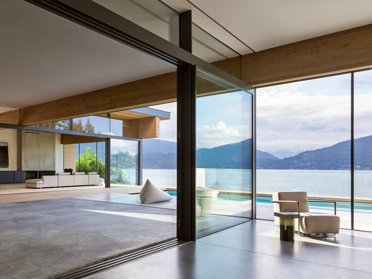入口处的下沉式庭院由混凝土墙构成,为车行区和人行区之间提供横向和垂直分隔;自然种植的花园庭院位于双层通高的中庭,向天空开放,将经过过滤的南向光线引入下方的室内空间;紧邻花园的户外客厅带有顶棚,为多季节活动提供场所;悬挂在房屋混凝土基座上方的休息平台面向一览无余的水景,容纳不断变化的自然环境。