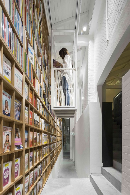 “集装箱”内包含非开放的服务区域和厕所。侧面的走廊以巨大的书架为特色,呈现了主要的展览区域,并且通向楼上区域,红酒吧和多功能区。