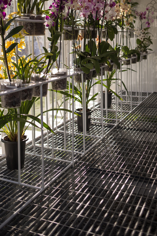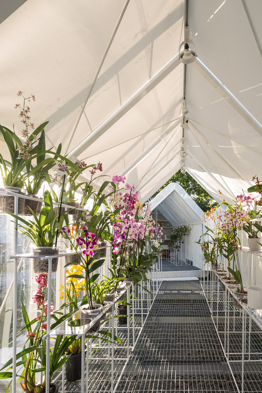 在疫情期间,一位钟情于兰花的植物学爱好者安娜(Ana)将自己的爱好投入了一种冒险的尝试:兰花温室,并委托我们设计了一个可兼作展览空间使用的温室。设计方案以一种透明、可运输、可更改的空间为原型,为兰花的生存创造了必要的气候条件。项目中共建造了两个温室,一个用于布设展陈,另一个则用于花卉种植。