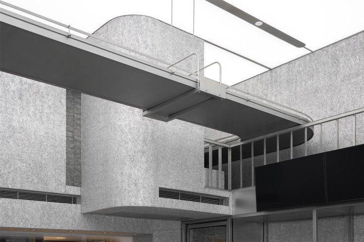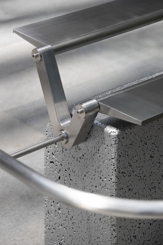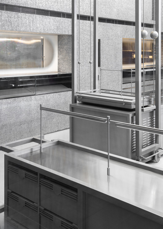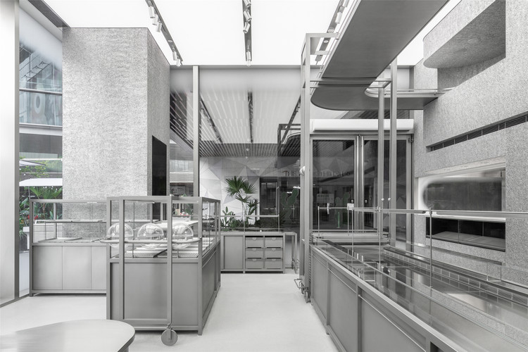 设计师将烘焙产品的陈列纳入对设计的考量之中,将机械部分的喷砂不锈钢与局部照明部件结合起来,借此在食物的温度与材料的冰冷之间制造戏剧式的冲突,将顾客的注意力聚焦在食物本身。