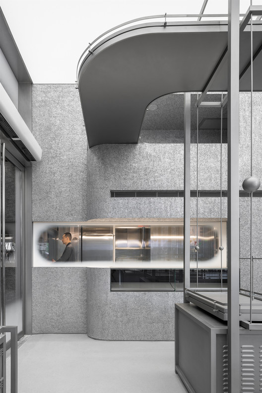 不同材质的拼接、覆盖、延伸都能让人们以最直观的方式感受空间的叙事性。泡沫铝、不锈钢等灰调材料在发光膜的均匀照射下表现出纯净的质感,通过对材料低饱和度的控制,确保机械装置作为叙事性主体存在于场景中。