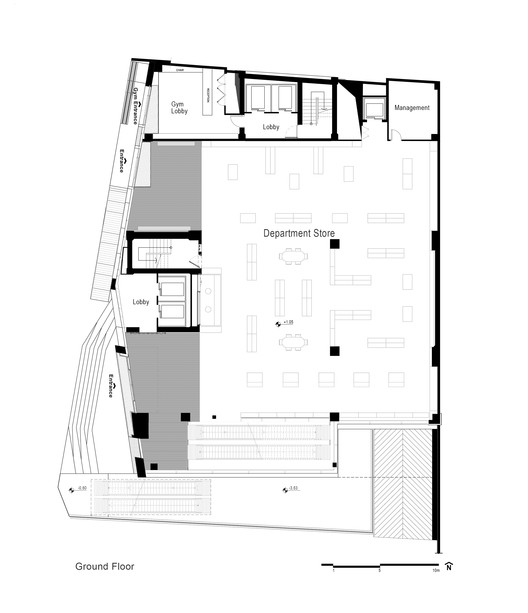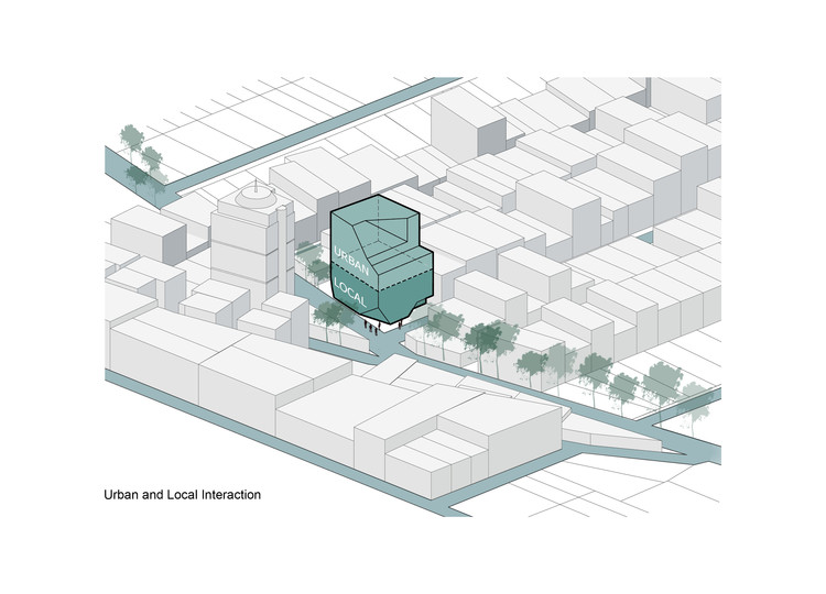 在假想线的下方,通过在主入口切割模块,并将模块的一部分交给街道,将市民的不活跃区域变为提供空间创造的可能。此外,行人停在入口台阶上的瞬间变成了街道的景观。在建筑的南侧切割模块,从而形成庭院,鼓励人们在建筑周围走动。现代化超市是南部庭院形成的产物,具有亲密的氛围,是当地的休闲场所,为满足附近居民的需要提供服务。