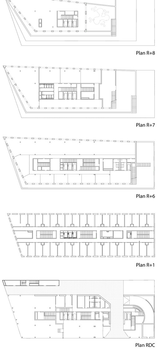 我们将许多独立功能的空间载入到这个大体量的空间中,因此,从立面及平面来看,空间得到了清晰的规划和利用。各功能空间围绕着中庭。从空间和技术上来说,不同层空间的规划采用了不同的模型,规划了严格高效的分区。中心的大尺寸空间创造了垂直的流线,表皮由大面积的整体平面构成,使得其很好测量。各层平面得到了理性的规划,很好辨认。在每层流线的终点,窗户勾勒出的城市边框让大量的自然光进入空间。