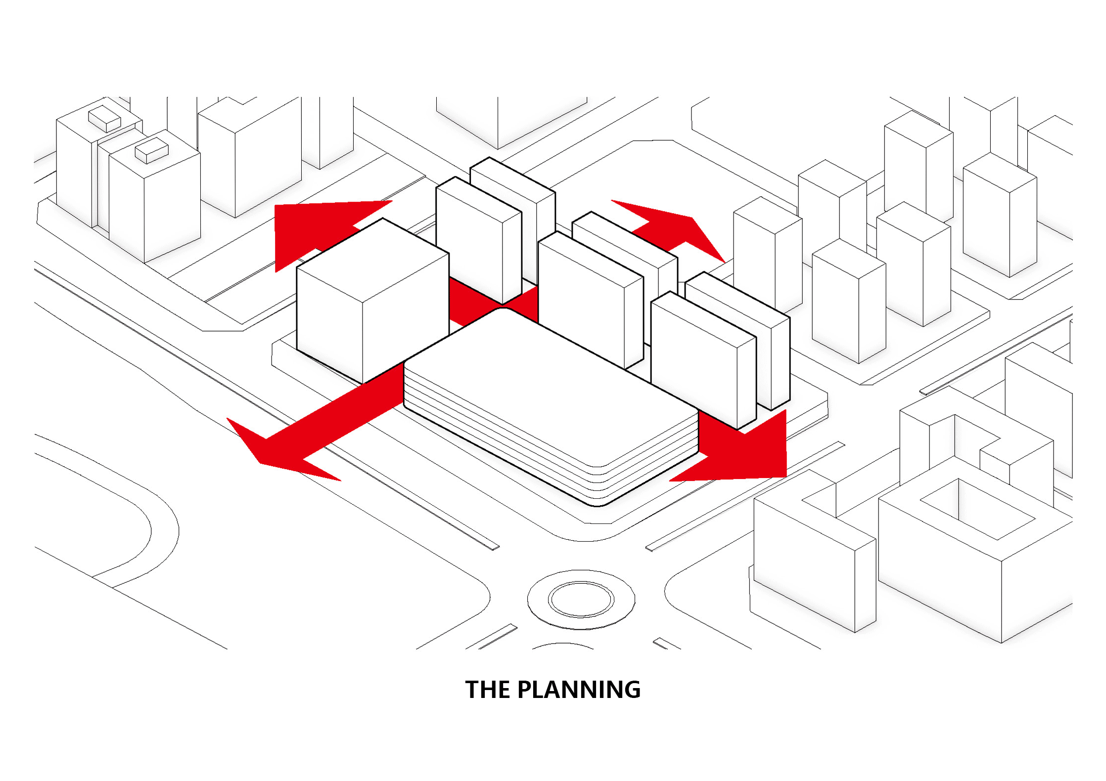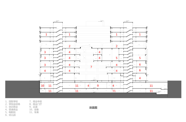 通过对学校、培训和商业功能的空间需求的梳理,我们按照从热闹到安静的空间属性,至下而上地把功能模块叠加在一起,再通过便于管理的空间节点将不同属性的空间分区管理,保证学校日常使用的安全性。同时,项目也需要相应上层次规划和地铁轨道线的影响,通过分切、退让和抬升等动作更好地回应场地限制条件。