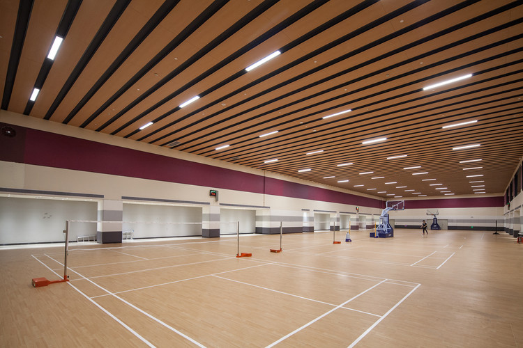 架空层是分割两种功能空间的一个过渡平台,也是学生户外运动和休闲的场所,U型围合的学校户外中庭空间提供户外篮球运动,户外剧场的可能,架空层还包含一个200米的跑道,学生图书馆,学生食堂等功能。