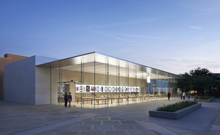 在此购物中心(人们)并不需要花费很长时间来了解这个品牌——全透明的落地玻璃显眼地从地面一直延伸到天花板,软质不锈钢使得遮篷的下方凑近时感觉在闪着微光,暖调的石头锚固在展厅内与环境融为一体,银白色的苹果商标则一如既往标志着入口处。