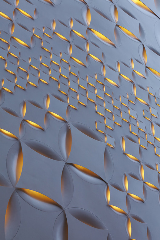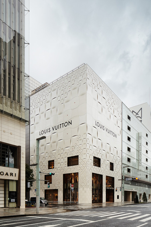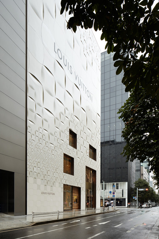 柔和的凹凸纹路装饰了米白色的建筑外墙。如此装饰的外立面在阳光的照耀下,呈现出不一样的光与影的效果。到了晚上,设置在图案背后的LED灯会照亮整个幕墙,用另一种表达方式让人联想到路易•威登的品牌文化。