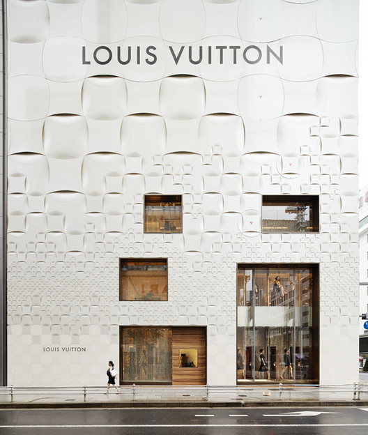 基于该品牌著名的双色格子重复图案,银座LV的外墙成为我们看到的柔和的方格图样,富有有机体的美感和丰富性。