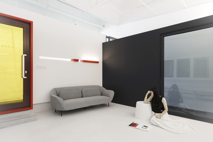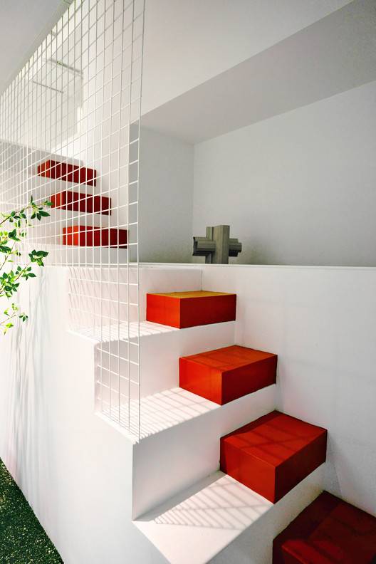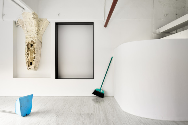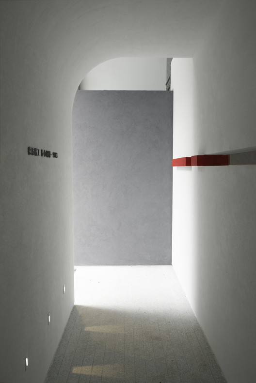 随着红色楼梯到夹层中,裸露的原始结构体、斑驳的表面和周围洁白的墙体形成强烈对比,呈现出时间的痕迹。