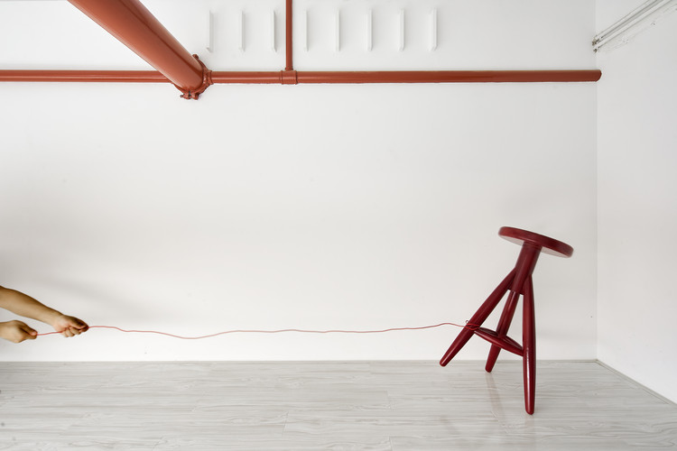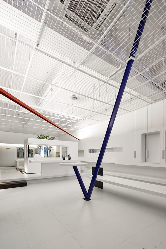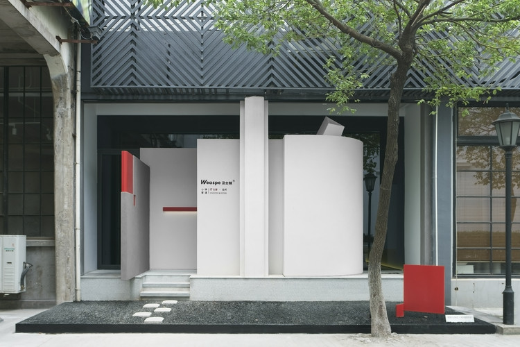 展厅入口区别于周围落地玻璃门的店面,以极具雕塑感的形体规定一种特定的进入方式。地面的红色雕塑,穿插的墙体裸露出的红色墙角,以及长条形窥视的窗口的红色边框,形成一个吸引人注意力的序列。