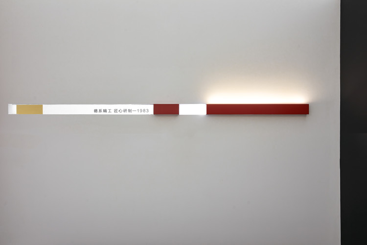 穿透到室外的深色长墙作为主要玻璃门展示,同时形成一条“时间长廊”。这个线性空间铺满碎石,红色的灯盒照亮卫士帕门窗品牌的历史。