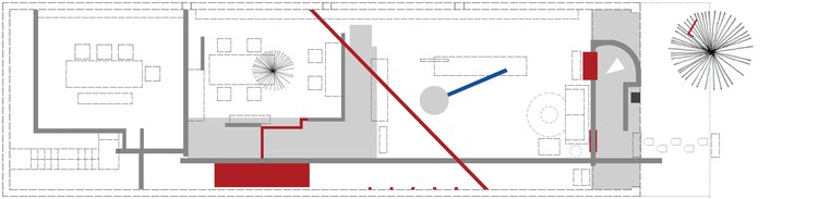 办公空间由一颗中心的绿树组织起一组半围合的矮墙,红色的线性元素在缝隙间流淌,暗示着时间的倏忽即逝。