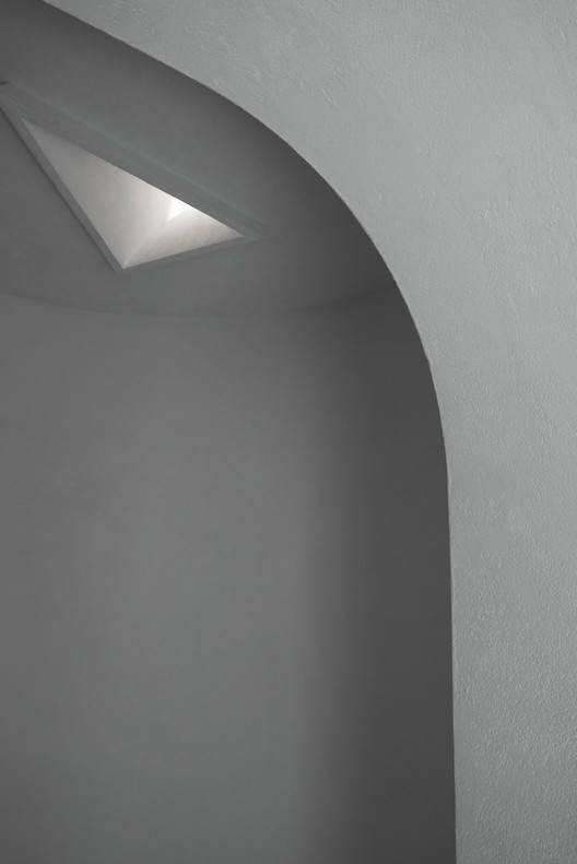 人从狭窄的廊道进入,在一个三角形天窗的注视下左转,通过一个红色的门进入待客空间。入口的狭窄灰暗形成空间上的欲扬先抑。