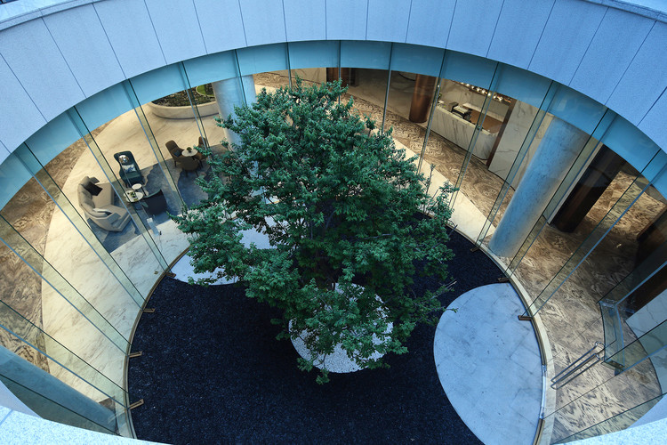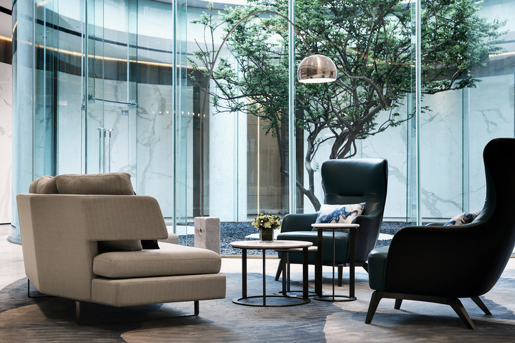 围绕圆形下沉庭院的洽谈区拥有通透视野,庭前树木为室内空间增加无限生机,临风玉树婆娑嫣然。一盏Flos落地灯勾出完美弧线,不介入洽谈只提供温暖的光,在大空间中辟出亲切的小气场。