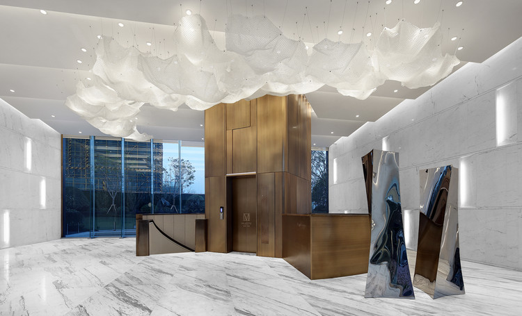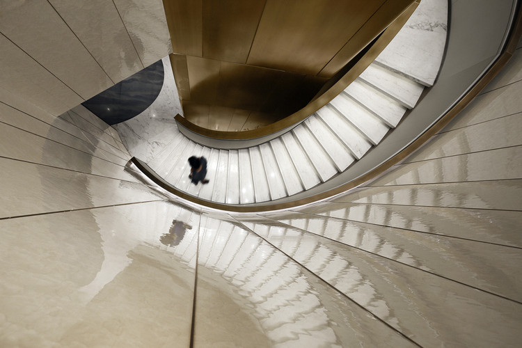 在白色的大理石引导下,沿着弧形楼梯拾级而下,地下的功能逐渐进入视线范围,扶手的铜和电梯的外表皮一致,动态的圆弧婉转成美妙的韵律。缘起缘灭,人生聚散大抵如此,而江水潮起潮落,则代代无穷尽。在电梯厅中视觉焦点集中在障景前安静陈列着一滴水,凝练着钱塘基因,汇聚成一湾潮水,倒映天下而与世无争。