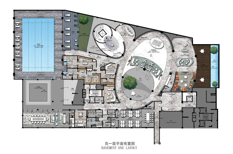 整个设计采用了特别的叙事方式,首层为接待大厅,把大面积的功能空间引入地下,通过电梯和弧形旋梯进入下沉庭院,创造出浪漫与神秘空间。