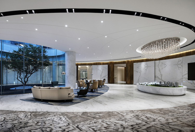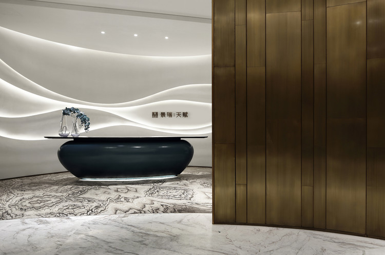 接待前厅设计师将轻波涟漪,动静交织,虚实相印作为表现意象。背景上荡开的水波层次分明,绵密柔顺如乐章,衬托着如霁蓝釉色的前台。铂晶山石形态的当代雕塑,透明精致,取名《凝石》。如果前面还是序曲微妙引导,来到大厅视野陡然扩大,则是洪波涌起,可谓“惊涛波澜来似雪,半入江风半入云”。大面积的留白设计让空间澄澈,展现出曲线美。