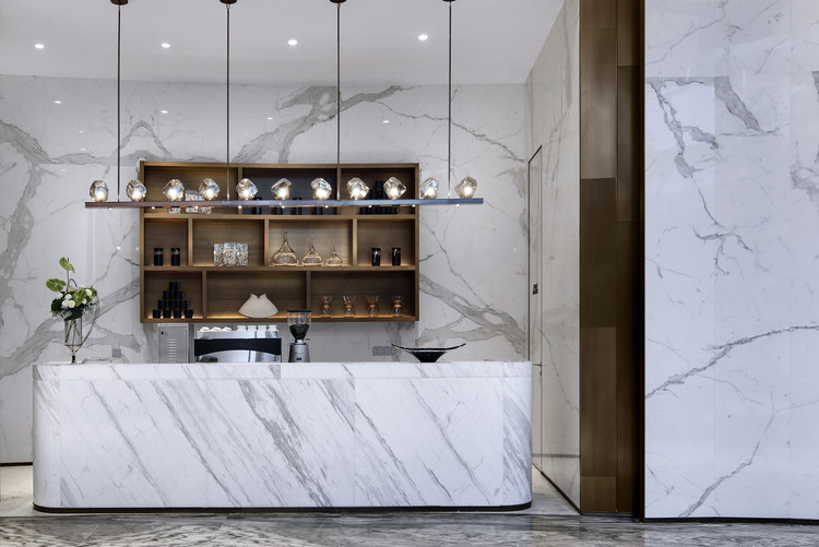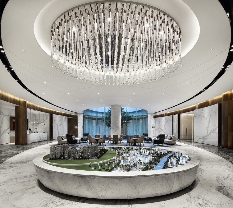 弧形展示空间中,视觉中心聚焦在项目沙盘上。水晶灯与沙盘呼应,上下联动,相互吸引。过廊弯转,将客人带入新的空间。弧形玻璃之外景观的自然之美和现代空间的利落形成对比。空间中大面积的白色石材纹理优雅,衬托出家具和陈设。 Jonathan Browning Studio的艺术吊灯,以磐石为灵感,几块萤石闪闪发亮连城一线,与极简的水吧台形成对景。