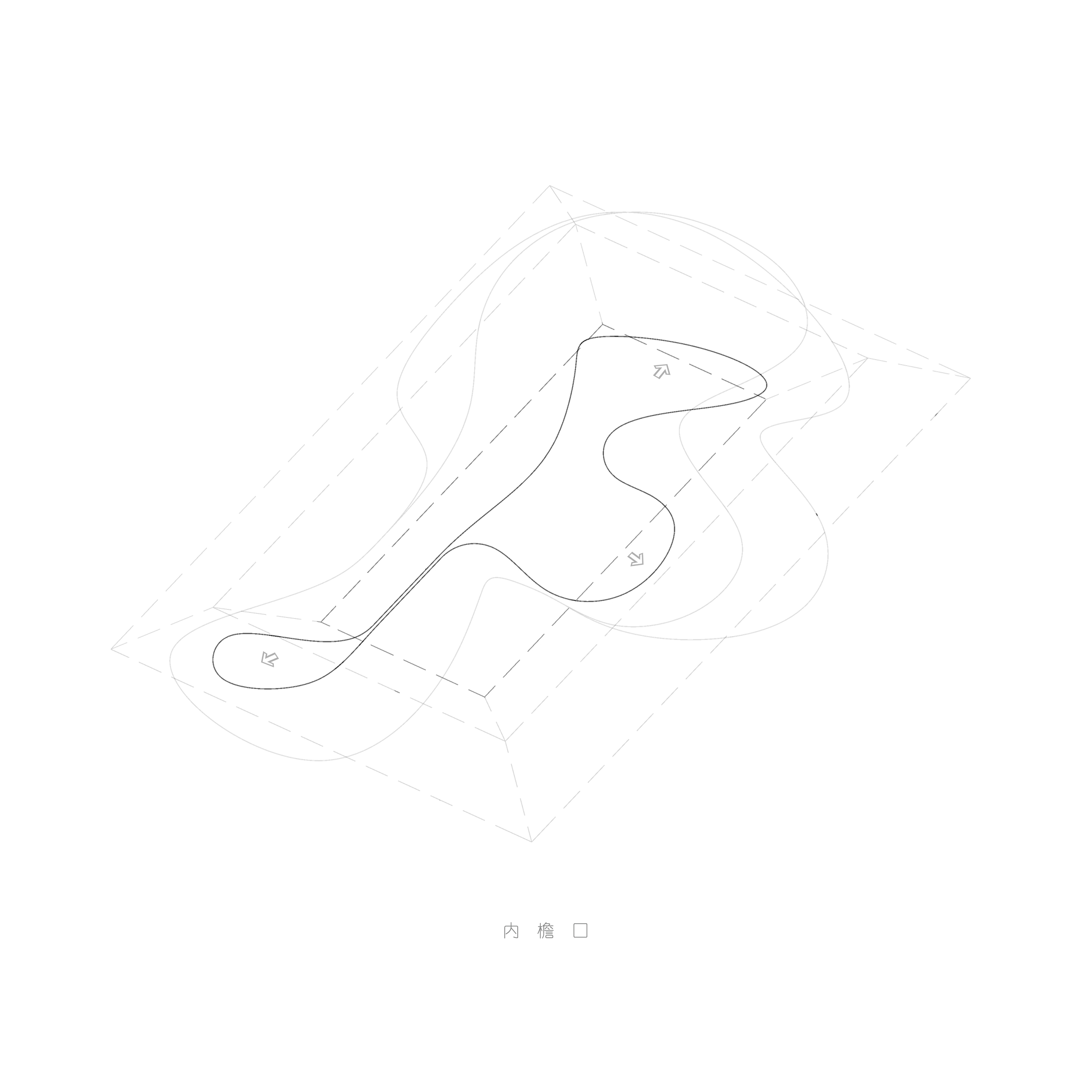 旧房檐之下,藏着另一座“新屋顶”。它们共享相似的形式逻辑——屋脊,内外檐口与清晰的双坡体量。又完全陌生,放弃显而易见的几何规则,新屋顶和窗外的河道共通了一种流畅的曲线,屋檐上下翻飞,有时作为邀请,有时作为屏障。