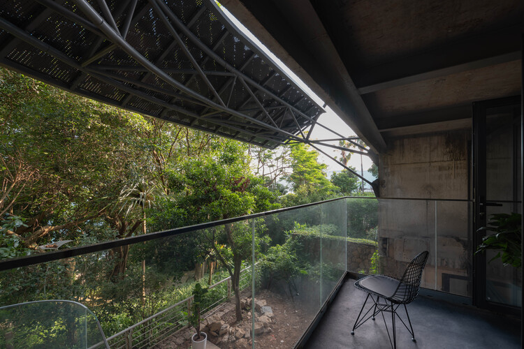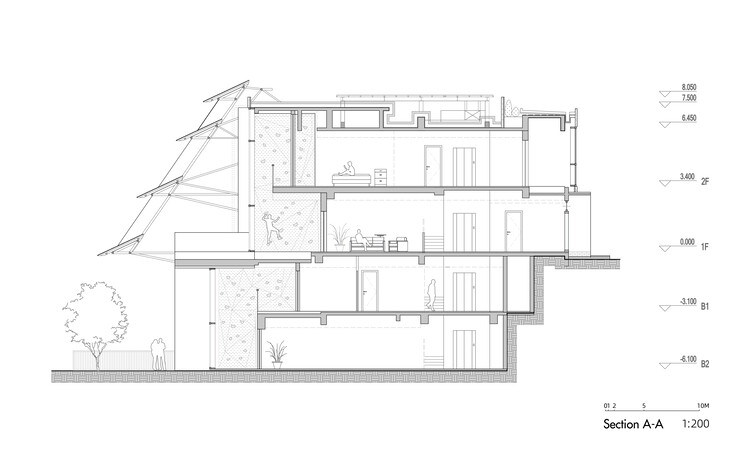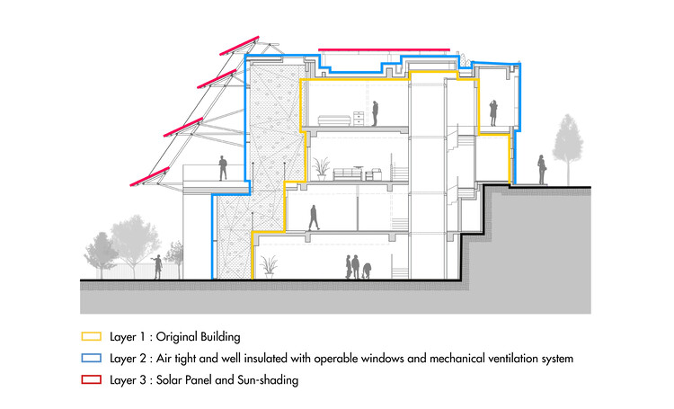 另一个改造策略是在三层外表皮之间的间隙空间形成混合的环境系统,在不同的天气条件下有着不同使用方式的灵活性。在温度适宜的天气,内层和中间层全部打开,形成良好的自然通风;在温度较高的天气,内层打开,中间层关闭,采用机械通风来促进室内空气的流通,对湿度进行一定程度的控制;在温度极高的恶劣天气,将内层和中间层关闭,开启空调和新风系统,并对湿度进行控制。这种表皮不同的开启组合方式,有效的减少了一年内空调的使用时间,并保证使用的舒适度。在中间层和外层表皮之间的间隙层为半室外空间,有通高的大露台、小阳台,以及地面的庭院空间,有着良好的遮阳和通风。中间层和内层表皮之间的间隙层为用于缓冲的通高室内空间,一边是整齐的玻璃幕墙,一边是凹凸变化的原住宅立面。结合各层交错的平台,以及四层通高的攀岩墙,形成了一个连接室内外的过渡空间。