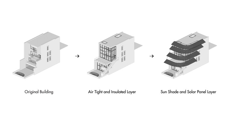设计团队的改造策略之一是采用三层表皮系统,该系统是将住宅升级为高效节能建筑的一种简单、可持续、成本有效的方式。单独去处理每一层表皮避免了将不同功能集成到单一建筑围护结构带来的复杂性,每层表皮之间也形成了灵活的间隙空间。最内层为原建筑立面,不做大动作改造。适当增大窗洞口,以增加自然通风、自然采光以及空间的开放性。中间层为气闭隔热层,为南北侧的玻璃幕墙和东侧外墙保温层,该层保证了空调使用时的节能效果。