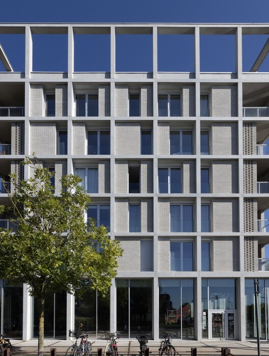 建筑立面采用了混凝土框架结构,这一设计呼应了该地区的工业历史。框架通过中性色调与灰色砖块的搭配,既与周边花园和河流景观相得益彰,又以穆沙拉比耶(Moucharabieh,又称“漏窗式”)砖砌工艺增添柔和质感。这片曾作为纺织业配套工业区的棕地,如今经过精心规划与改造,旨在打造一个可持续且宜人的环境,并通过发展欧洲科技园区(EuraTechnologies,这一数字创新领域的领先枢纽)来助力里尔市更宏大的经济愿景。最终,这里形成了一个生态城区,将住宅、工作场所、公共空间和休闲设施完美融合,同时严格遵循高标准的环境保护要求。