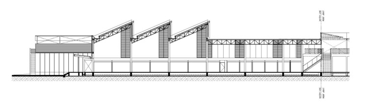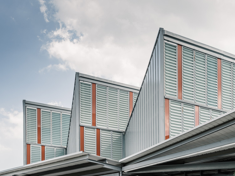 屋顶向一侧翻转使两个部分之间形成一条直线。第二期采用与第一期坡面相同的一系列锯齿形屋面形式。新屋顶的朝向为了捕捉北侧的光线,采用玻璃百叶墙,可以在半透明和彩色玻璃面板之间转换,将热空气传导到顶部。