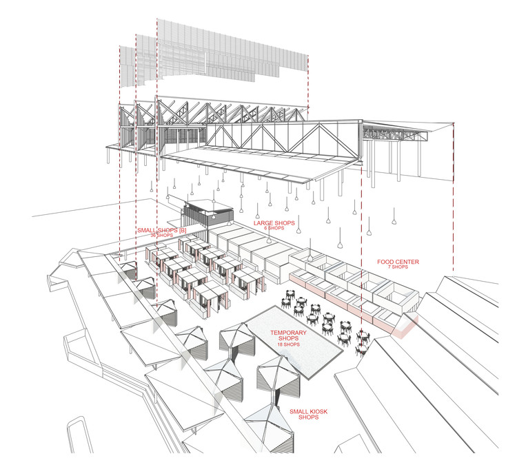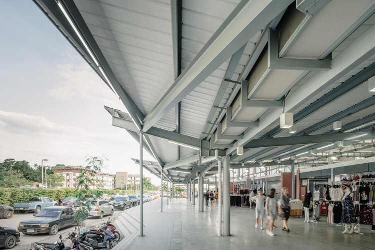 该项目是对位于素万那普机场附近一个社区内售卖食物和服装的露天市场的改造。 开发商希望在保证店铺灵活性和容量的基础上充分利用土地。在2000平方米建筑面积范围内,我们探索了所有可能的形状、方向以及空间的最佳使用方式。