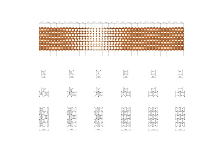 每个盒子的大小相同,并以其独特的外立面图案为特色。镂空的外立面采用金棕色铝板作为材料,以上下内凹六边形为基本单元,每1.2m为一个结构跨度,立面结构自成一体独立支撑。通过六边形的边宽变化创造出的极具节奏感的立面在保证造型的同时也照顾到了通风与光照。